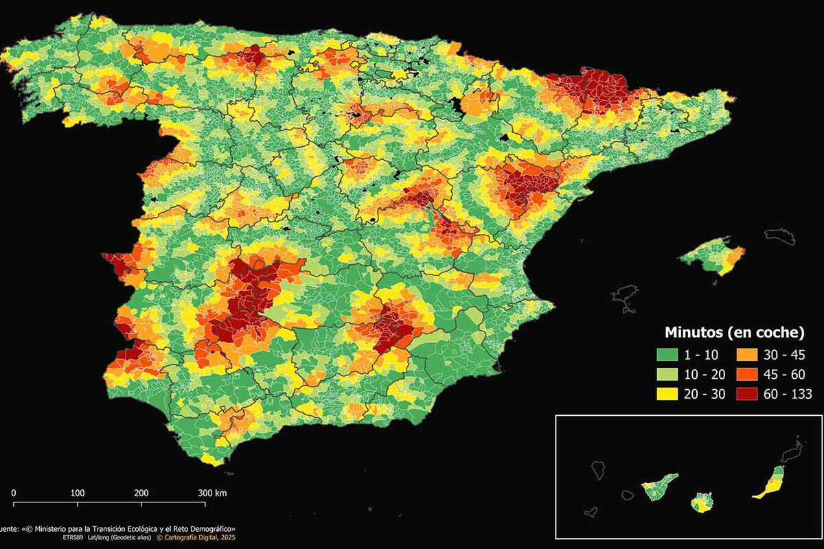 En realidad este mapa se basa en este elaborado por el ministerio para la Transición Ecológica, que es similar pero con el color azul para las zonas que conectan en menos de 10 minutos con una autovía y en rojo para las que superan la hora de trayecto.