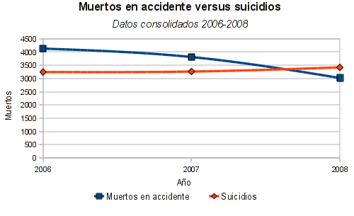 Sin embargo, al ritmo al que baja la mortalidad en el asfalto, va a ser muy difícil evitar tanto suicidio como para que la rebaja sea paralela. Entre 2006 y 2008 la mortalidad en carretera bajó casi un 30%, normal que una causa haya tomado el relevo de la otra en nuestra sociedad.