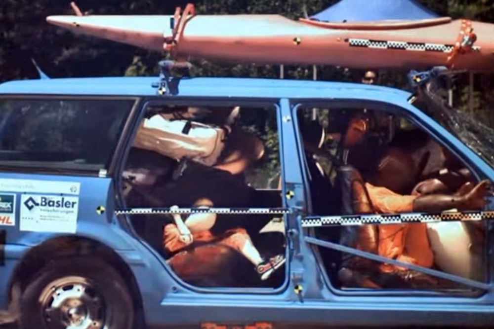 Las maletas que van en la zona superior de carga atraviesan el habitáculo con suma facilidad hasta impactar con los ocupantes de la parte delantera, mientras que los bebés dummies de los asientos traseros son espachurrados sin piedad por la carga de la parte inferior. Lo del kayak reconvertido a misil balísitico lo dejamos para otro día.