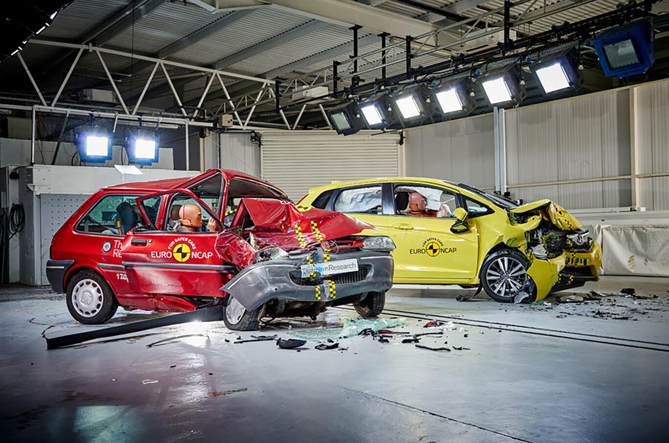 El famoso Rover 100 de 1994 frente a un Honda Jazz (2013-2020). Los progresos realizados en seguridad son abrumadores.
