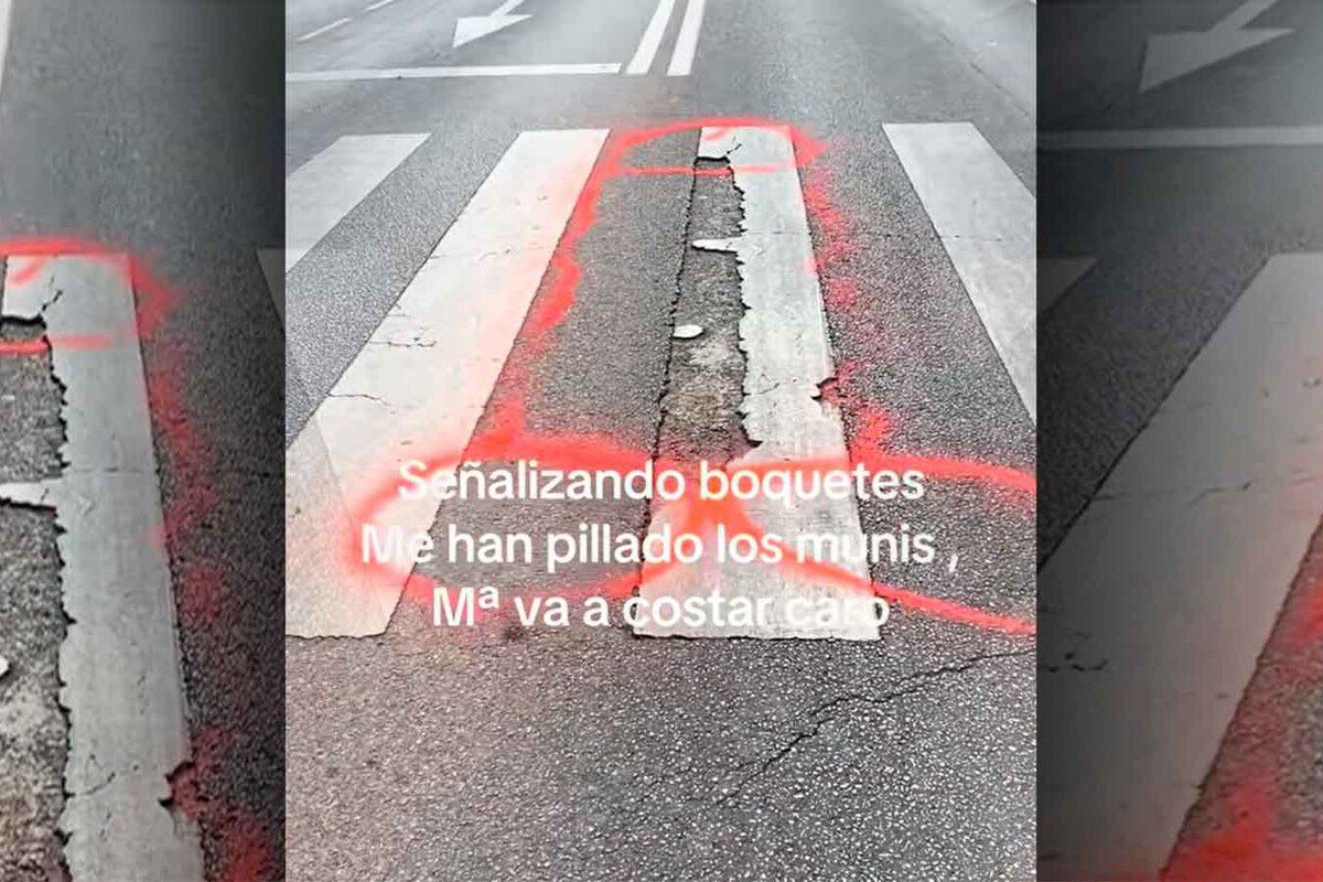 "El Ayuntamiento que bueno es que nos señaliza los rotos en la carretera", comenta entre risas mientras lo muestra en el vídeo. Entonces fue cuando pasó una patrulla de la policía secreta. "Me han pillado". Pese a que asegura que fueron muy amables, no se libró de la multa: es una infracción a la ordenanza de convivencia por hacer pintadas en la vía pública. Puede suponer una multa más de 250 euros.