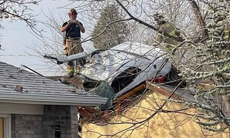 Este Dodge Challenger que ves en el tejado de una vivienda voló más de 10 metros hacia el cielo y acabó ahí tras rebotar del techo de la casa contigua. Es el resultado de ir con exceso de velocidad por un barrio residencial y tomar demasiado rápido una curva cerrada.