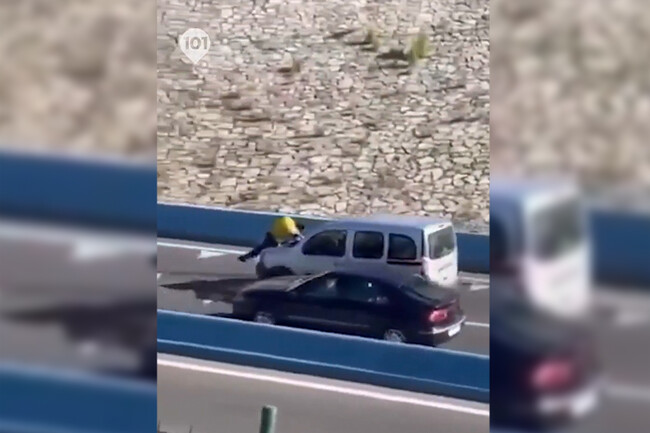 Imagina que vas tranquilamente por la autopista y te adelanta por la derecha una Mercedes Citan plateada con un repartidor de Glovo, mochila en la espalda, encaramado a su capó. Es justo lo que pasó este sábado, sobre las 12:30, en la incorporación a la A-7 a la altura del Centro Comercial Puerta Europa, en Algeciras, en sentido a Málaga.