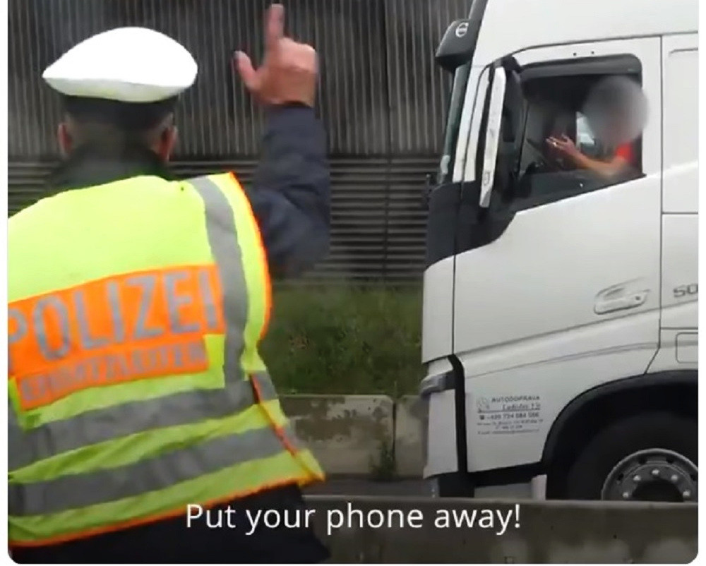 Así es como el policía acompaña a un hombre que ha sido sorprendido en plena autobahn, cerca de Núremberg, fotografiando un siniestro vial a la caza de posibles víctimas de tráfico. Mientras caminan, el agente le echa una tremenda bronca a otro hombre, que desde su camión también retrata la escena.