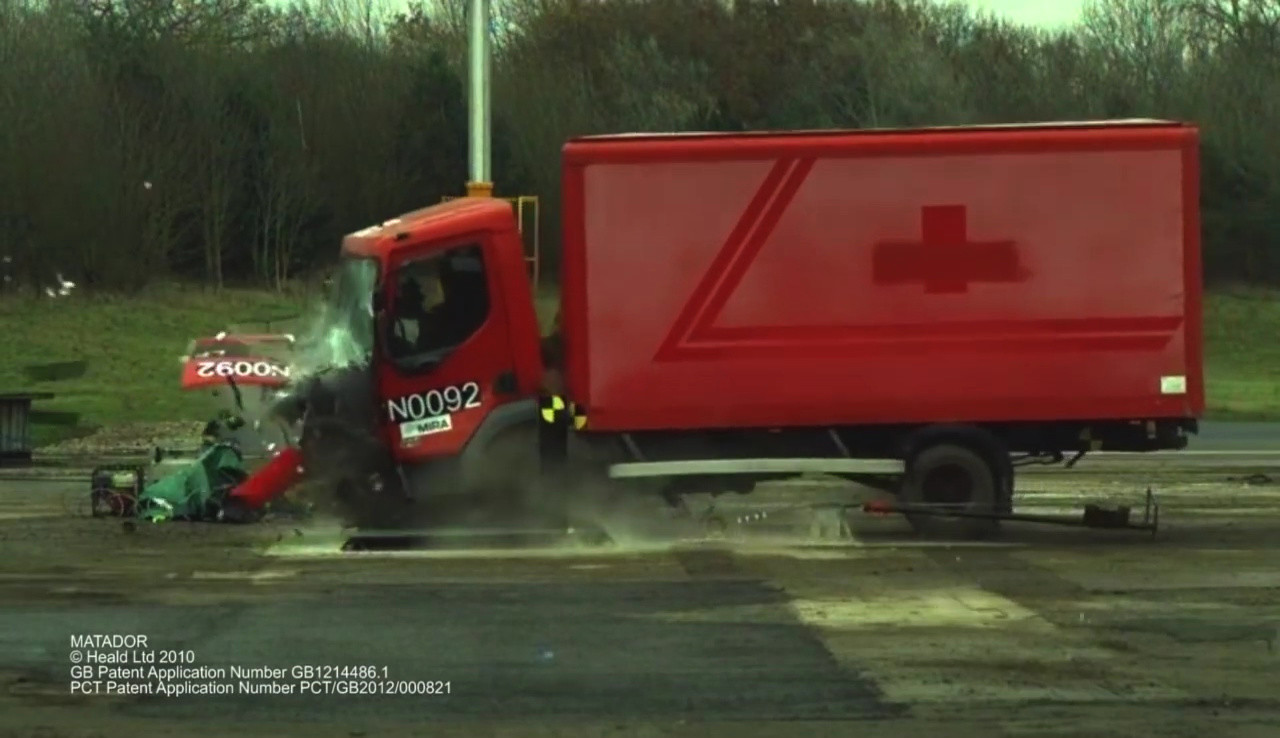 Y sí, en los últimos tiempos Heald ha vuelto a la primera página de la agenda con su invento. Por motivos que no se le escapan a nadie, claro. Así es como el HT2-Matador se opone a que un camión continúe su camino, a una velocidad de 64 km/h (la estándar en un crash-test frontolateral para turismos):