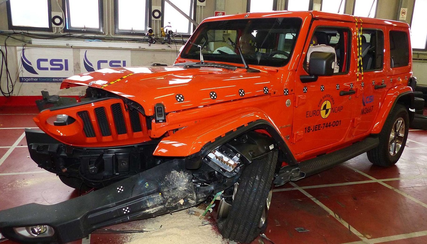 El organismo independiente Euro NCAP acaba de dar un buen batacazo al Jeep Wrangler al puntuarlo con una sola estrella. En el test de impacto frontal, a 64 km/h, el todoterreno queda tan dañado que la organización duda de que pueda soportar una carga mayor.