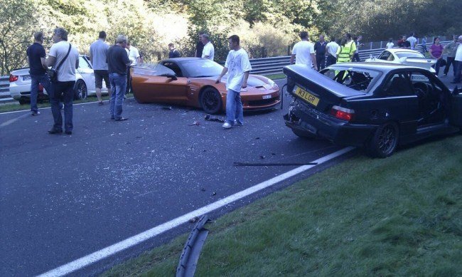 Ayer domingo (vaya, domingo de Dolorpasión™, que casualidad…) el Nürburgring se cerró durante un buen rato por una colisión múltiple en la que se vieron implicados ocho vehículos, entre ellos un Chevrolet Corvette Z06 de alquiler (más le vale que no haya sido su culpa), uno de los nuevos BMW M3 “Taxi-Ring“, un BMW serie 3, un Porsche 911 SC Carrera (parece, si me equivoco corregidme) y otros cuatro coches más que no vemos.