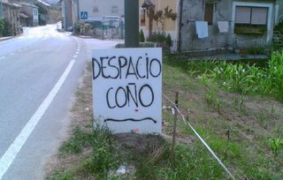 Este pueblo debe ser uno de esos que sufren los excesos de velocidad en travesía. Y no me extrañaría nada que algún coche ya haya acabado contra la casa que se ve al fondo. Así que a falta de carteles luminosos de la DGT, imaginación y guasa española al poder…