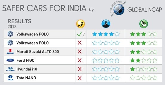 El utilitario alemán saca un horrible resultado de cero estrellas, aunque con dos airbags logra cuatro estrellas. Volkswagen ha decidio suprimir del mercado indio la versión que no los tiene. La estructura aguanta lo suficiente y da una protección aceptable con doble airbag. El Polo europeo tiene más airbags y de serie.