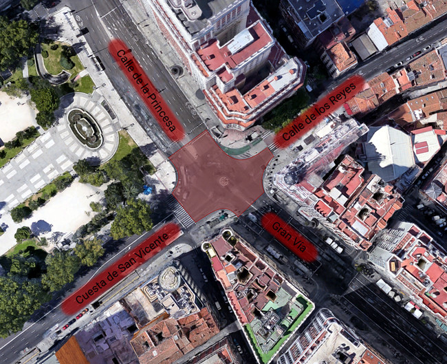 Madrid estrenará en 2019 un enorme paso para peatones en la confluencia entre las calles Gran Vía, De los Reyes y Princesa, que permitirá a los viandantes cruzar de forma simultánea en todas las direcciones, incluso en diagonal. Es la primera vez que se hace algo así en España, y el precedente más claro se encuentra lejos, en Shibuya (Tokio, Japón).