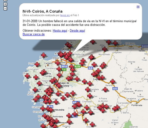 Me ha llamado la atención un mapa creado por La Voz de Galicia en el que se muestran los lugares donde se han producido muertes en la carretera a lo largo de todo 2008 en Galicia. De él se pueden extraer algunos datos, básicamente no hay sorpresas y los puntos coinciden con los lugares de mayor densidad de población.