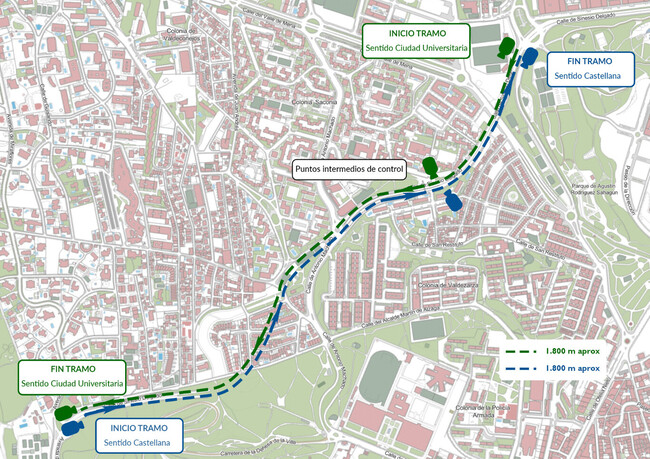 - Sentido Ciudad Universitaria (1.783 metros). Cámara de inicio de tramo: glorieta Piedrafita de Cebrero (a la altura de la zona deportiva de Ganapanes). Cámara intermedia: intersección con la calle Valdeverdeja. Cámara de fin de tramo: intersección con avenida de Miraflores.