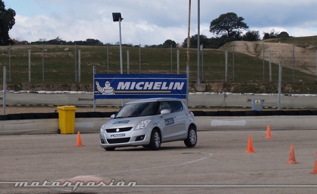 La primera prueba que realizamos fue el trazado de una curva cerrada a unos 60 km y sobre pavimento seco. Conducimos siempre un Suzuki Swift diésel (un coche decente y asequible de lo más convencional, de esos que tú y yo nos podemos permitir comprar) con neumáticos Michelin Primacy, pero uno llevaba todas las ruedas nuevas y el otro llevaba las ruedas traseras gastadas. Primero probamos con el control de estabilidad (ESP) desactivado.