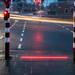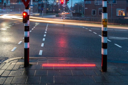 Aunque la medida no es nueva, cada vez es más popular tanto en Europa como en muchas ciudades españolas: tiras LED incrustadas en el pavimento que replican la señal del semáforo justo en el campo visual de quienes caminan con la cabeza agachada. Es decir, la línea luminosa en el borde de la acera se ilumina en rojo o verde a la vez que el semáforo convencional.