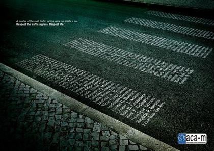 Cruda y dura campaña de concienciación para Portugal, promovida por la ACA-M (Associacao de Cidadaos Auto-Mobilizados), que trata de sensibilizar a los conductores con un claro mensaje con los nombre de las víctimas de atropello pintados en el suelo formando un paso de cebra.