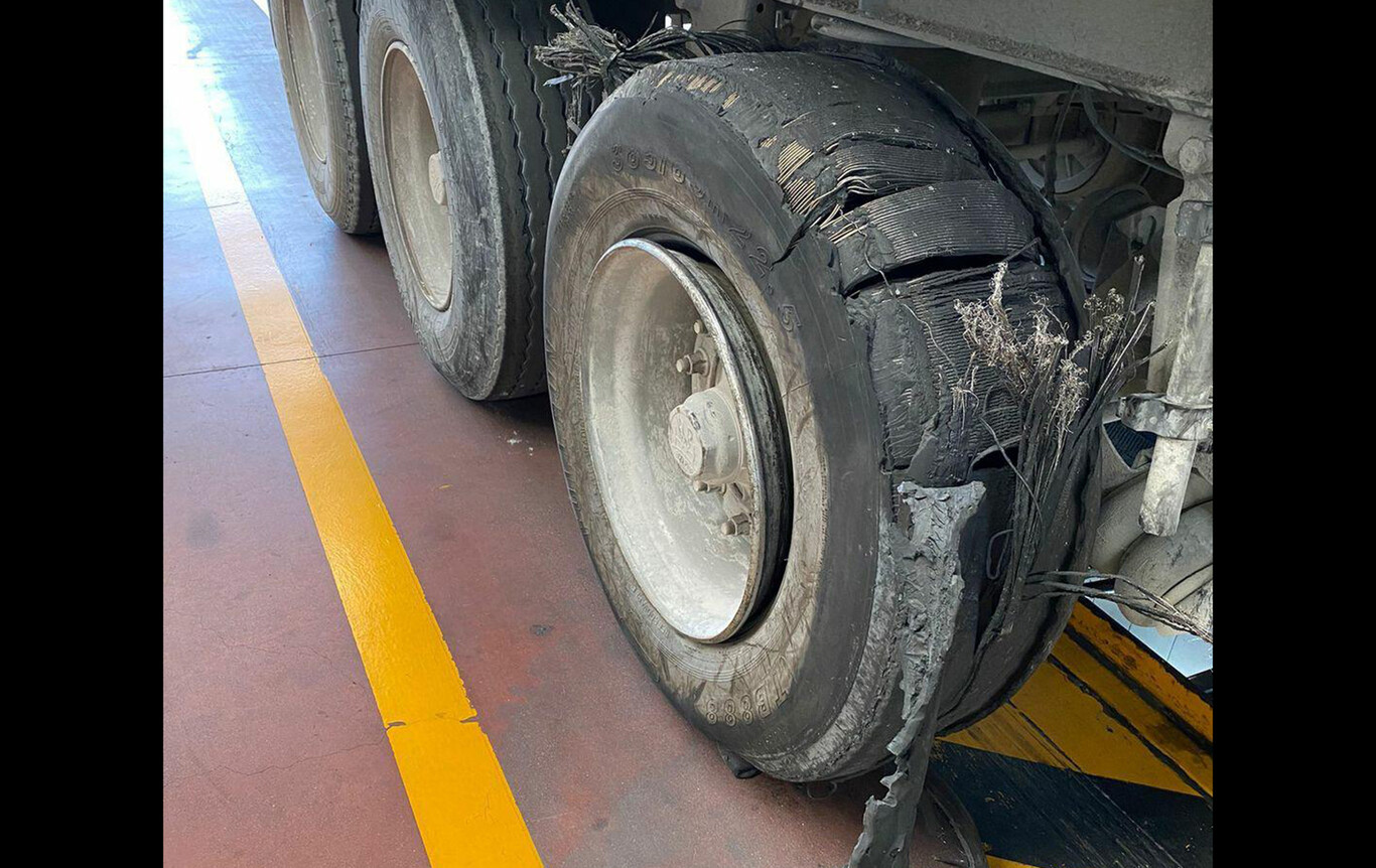 Surrealista como poco. Un conductor de camión se presentó en la ITV para pasar la inspección técnica del vehículo con uno de los neumáticos de esta guisa: con la cubierta completamente reventada y los alambres colgando.