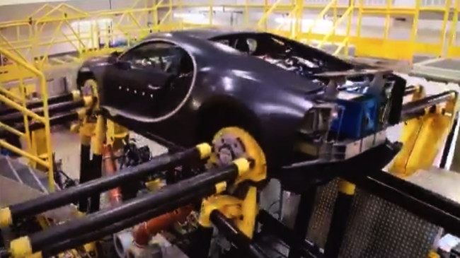 En efecto: el Bugatti Chiron se entrena para Nürburgring (y lo que surja) usando unos utillajes que, en movimiento, resultan alucinantes. Tanto el banco que menea el motor como el artilugio que pone a prueba la suspensión —y que parece sacado de una extraña cámara de torturas mecánicas— deben de valer su peso en oro, si tenemos en cuenta el dinero que deben de ahorrar al evitar meter coches y más coches en circuito.