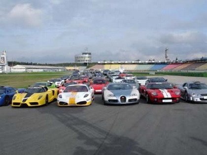 No es el sueño erótico de todos los lectores de Motorpasión, es real. Se trata de una concentración de superdeportivos (osea, cochazos con mayúsculas) en el circuito de Hockenheim. Un Enzo por aquí, un Carrera GT por allá, un McLaren F1… ah, sí, también un Veyron. Venga, ¡que los regalan!