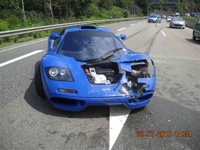 Apenas hay poco más de un centenar de McLaren F1 en el mundo. El dueño pudo esquivar el grueso del atasco y reventar el coche/matarse, y en su maniobra de esquiva acabó colisionando con un par de vehículos que estaban parados. El golpe parece poca cosa, pero supercoche implica superprecio de taller.