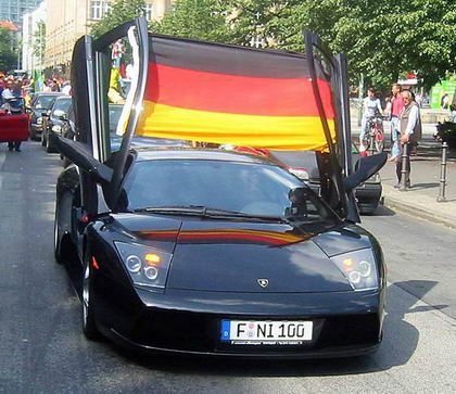 ¿Cómo llevar la bandera de tu selección en el coche durante las celebraciones post-partido? El coche más adecuado parece ser el Lamborghini Murcielago, ya que podemos enganchar la bandera entre las dos puertas de alas de gaviota abiertas.