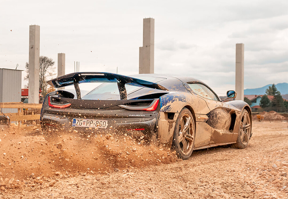 Así que en la firma croata se han puesto creativos y han optado por hacer bailar a una de estas unidades destinadas a crash test en un terreno que no es ni mucho menos el de este aerodinámico superdeportivo de casi 2.000 CV: el barro y la tierra.