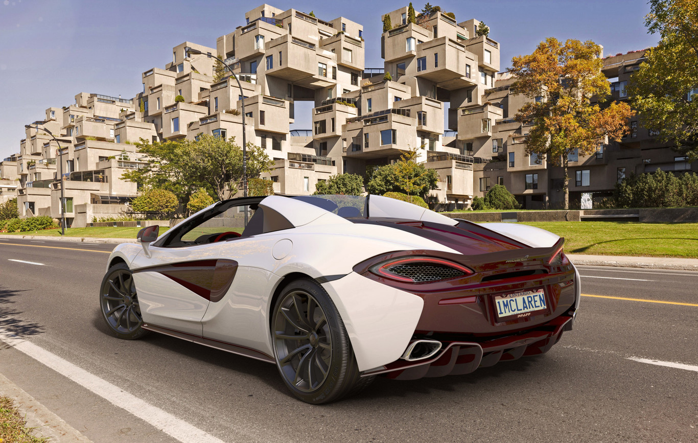 Las zonas granates de la carrocería son de fibra de carbono vista pero tintada en dicho tono, y están presentes en la zaga, en el lateral del vehículo e incluso en el pilar trasero. También llaman la atención la bandera de Canadá en lugar del distintivo 570S lateral o la típica hoja de arce, pintada en color blanco en la zaga.