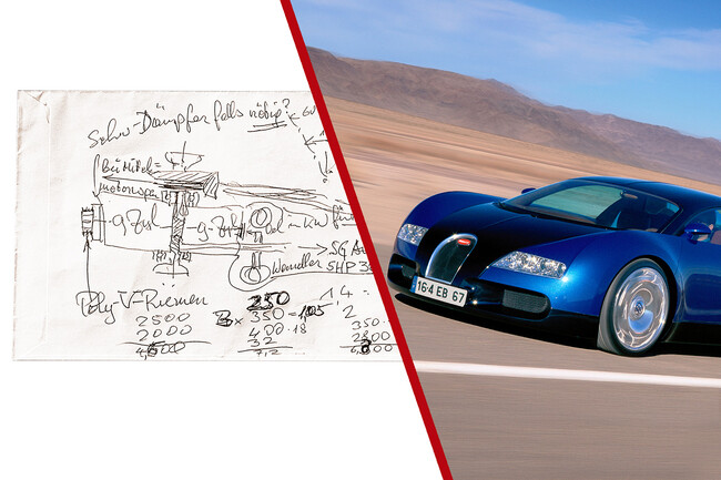 El Veyron de producción batiría récords de velocidad máxima y establecería un listón casi imposible de superar hoy en día, y todo empezó con un boceto en un sobre y la compra de una miniatura.