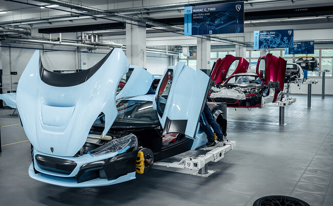 Esta línea de producción alojada en las dependencias de Veliko Trgovišće se divide en cinco áreas. Por ejemplo una solo está dedicada a ensamblar su chasis monocasco de fibra de carbono y otras para la carrocería y su pintura. Además cada unidad pasa por diferentes zonas donde se somete a pruebas estáticas, por ejemplo para comprobar que no presenta filtraciones ante una intensa lluvia o para calibrar los neumáticos, mecánica y frenos.