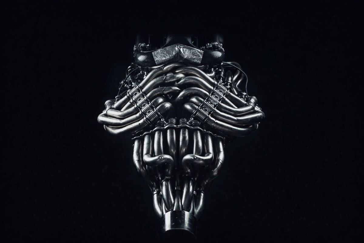 El peso del conjunto resume bien esa filosofía. La marca cifra en unos 220 kg el V12 con sus elementos asociados, un dato que habla de una obsesión real por aligerar. Y, ya que estaban, lo han rematado con un escape que parece hecho a mano: doce tubos que salen del motor, se retuercen con una lógica casi “viva” y terminan uniéndose en una sola salida central. Poesía para la vista, y para el oído.