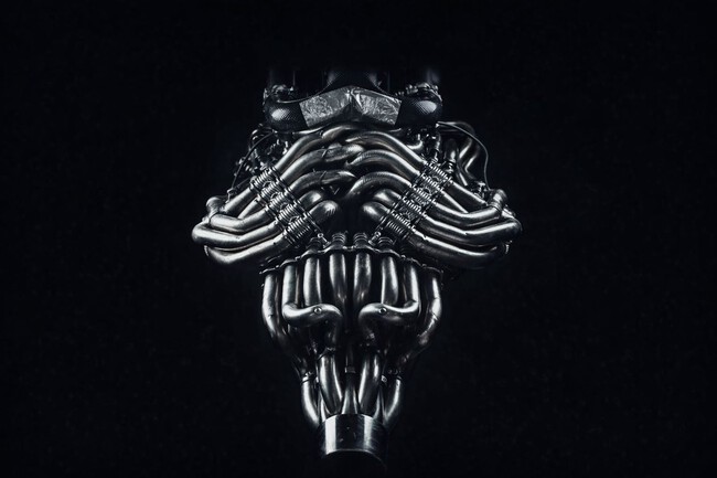 El peso del conjunto resume bien esa filosofía. La marca cifra en unos 220 kg el V12 con sus elementos asociados, un dato que habla de una obsesión real por aligerar. Y, ya que estaban, lo han rematado con un escape que parece hecho a mano: doce tubos que salen del motor, se retuercen con una lógica casi “viva” y terminan uniéndose en una sola salida central. Poesía para la vista, y para el oído.