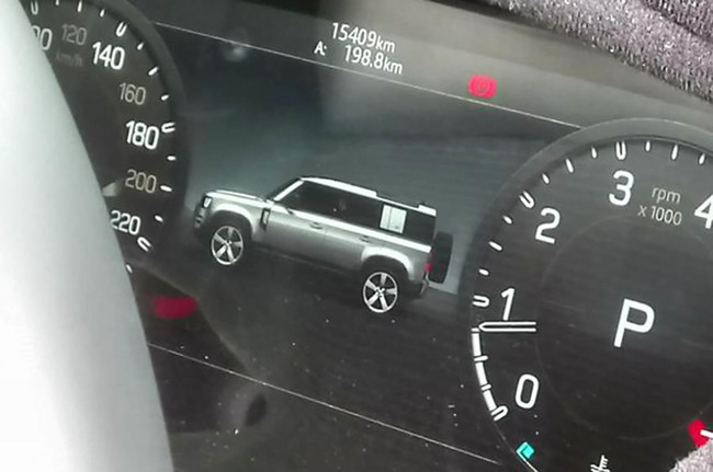 Se trata de la foto de un cuadro de instrumentos digital de un prototipo (en la parte superior se aprecia parte de la tela que llevan los prototipos de desarrollo para que no se vea el salpicadero). Y entre el cuentarrevoluciones y el velocímetro se aprecia una vista de perfil de lo que sería el nuevo Land Rover Defender.