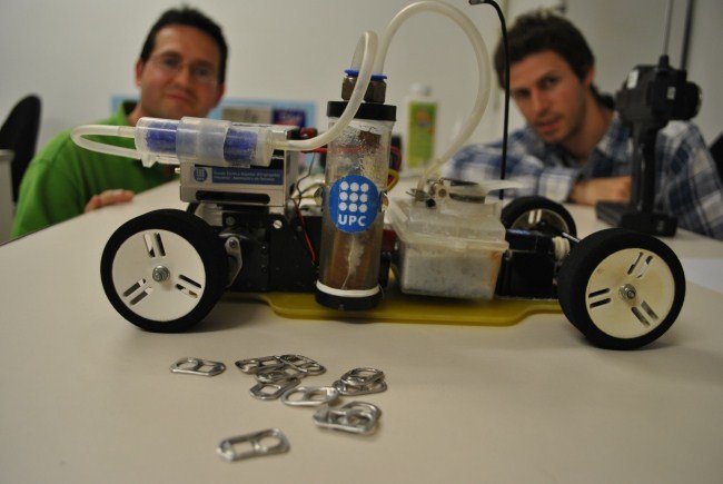 Pero en la Escuela Técnica Superior de Ingeniería Industrial y Aeronáutica de Terrassa (ETSEIAT), un equipo formado por un profesor y un alumno ha conseguido hacer funcionar un coche teledirigido que funciona con un combustible muy especial. Al depósito se le echa aluminio en forma de anillas de latas de refresco y salfumán.