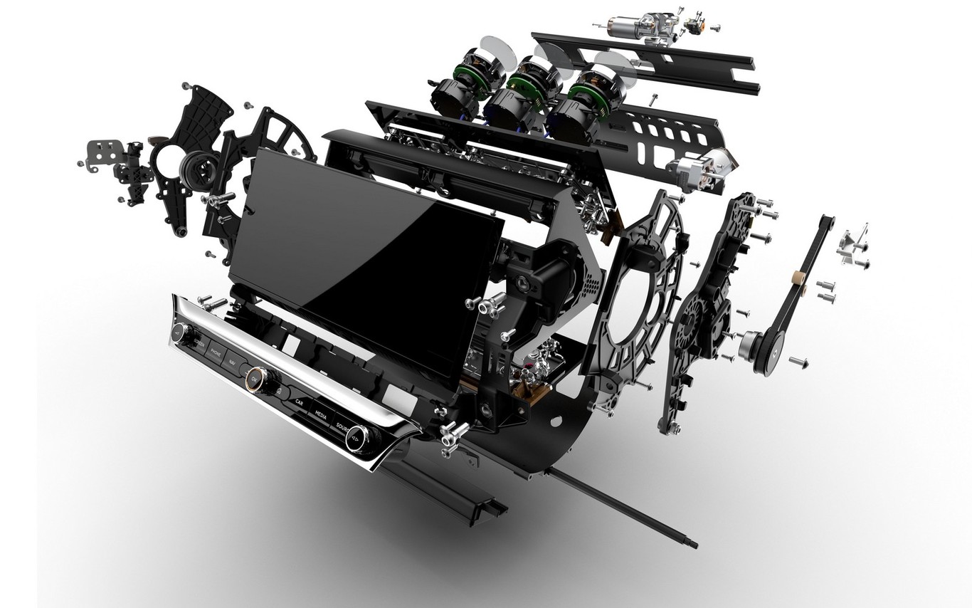 Este complejo mecanismo está formado por más de 150 piezas, dos motores y cajas de engranajes separadas que consiguen rotar la pantalla táctil de forma que desparezca y abra paso a un estilo más clásico.