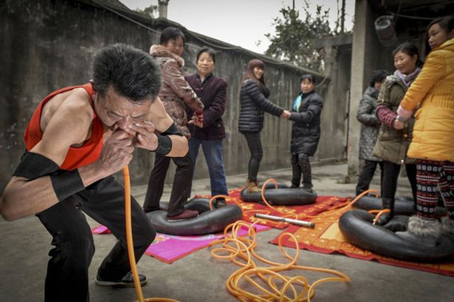 La propuesta de Nie Yongbing, si es que es así como se llama el tipo de la foto, es (como mínimo) insólita. Inflar neumáticos con la nariz es una de esas actividades que uno no suele poner en el currículum, aunque durante la semana pasada, mientras todos estábamos pendientes de Detroit, este hombre consiguió en China su momento de gloria con un par de narices.
