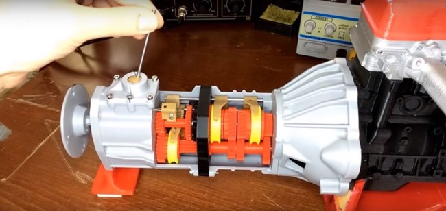 Hoy vemos una obra en la que se ha utilizado bastante menos material, es simplemente una caja de cambios. Pero no es tan fácil como parece, hablamos de una caja de cambios manual, a escala, de cinco velocidades, con marcha atrás y totalmente funcional, un trabajo impresionante.