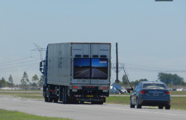 Se trata de un sistema de cámara frontal de vídeo y grandes pantallas situadas en la parte trasera del camión para que los vehículos que circulan por detrás puedan ver qué sucede por delante del camión. Este sistema se desarrolló en Argentina y allí mismo ya se está probando en carretera para comprobar su efectividad en condiciones reales. Las ventajas son claras, ¿pero y los inconvenientes?