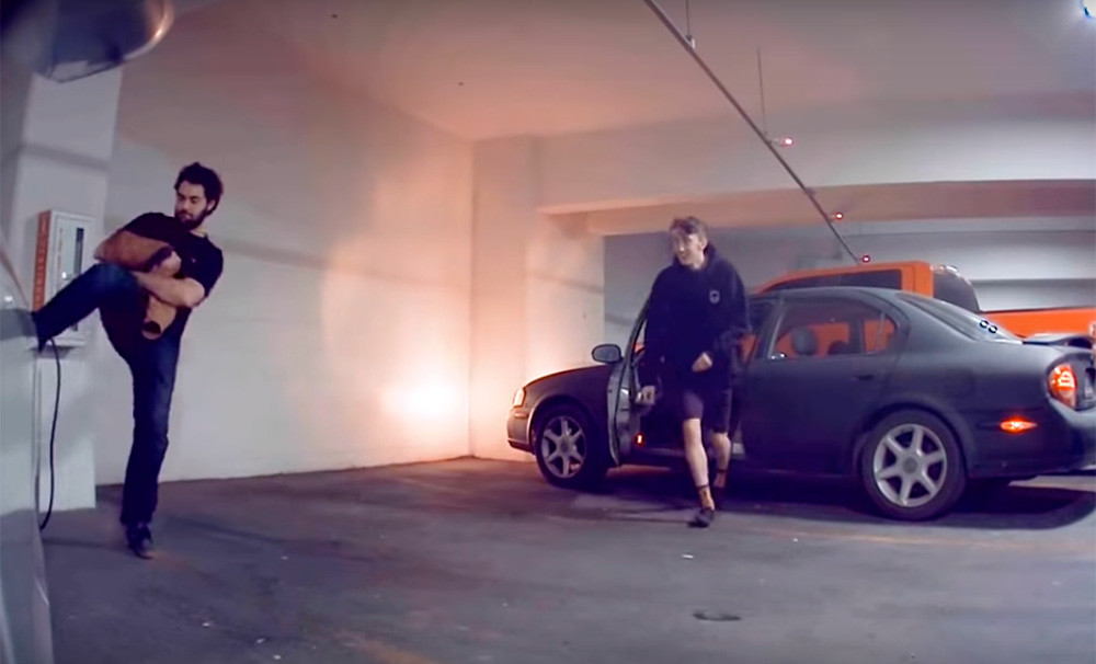 El compañero se une a la fiesta y también propina un puntapié al Model 3, momento en el que se activa la alarma del automóvil: entonces, ambos se asustan, se montan en el coche y escapan de la escena, quizá sin saber que las cámaras del modelo californiano habían grabado la situación.