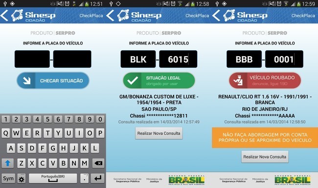 CheckPlaca (antes _Consulta Veículo_) es una aplicación web y móvil del Ministerio de Justicia de Brasil que da la información de las matrículas. Si hay una situación irregular, como que se busca por robo, nos pide que avisemos a las autoridades. Así de simple.