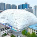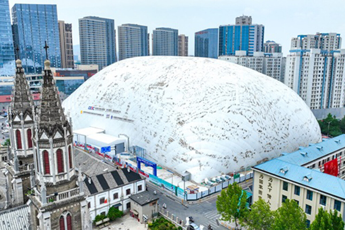 Una burbuja gigantesca y tecnológica, reutilizable. La enorme burbuja hinchable utilizada en Jinan es una membrana presurizada de tamaño gigantesco: de 50 m de alto, 195 m de largo y 108 m de ancho, cubría una zona de 20.000 m2. Se colocó durante la fase de demolición y excavación inicial, las que más afectan en términos de ruido y polvo.