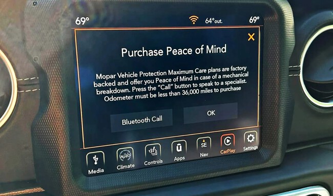 Sirva de ejemplo el caso de un propietario de un Jeep y usuario de Reddit que dice que su Grand Cherokee de 2022 no deja de mostrarle anuncios emergentes en la pantalla central del coche, cada vez que se para en un stop o en un semáforo en rojo. Además de sufrir el spam invasivo que le insta a “comprar tranquilidad” contratando un plan de garantía extendida, esta publicidad no es nada sencilla de eliminar.