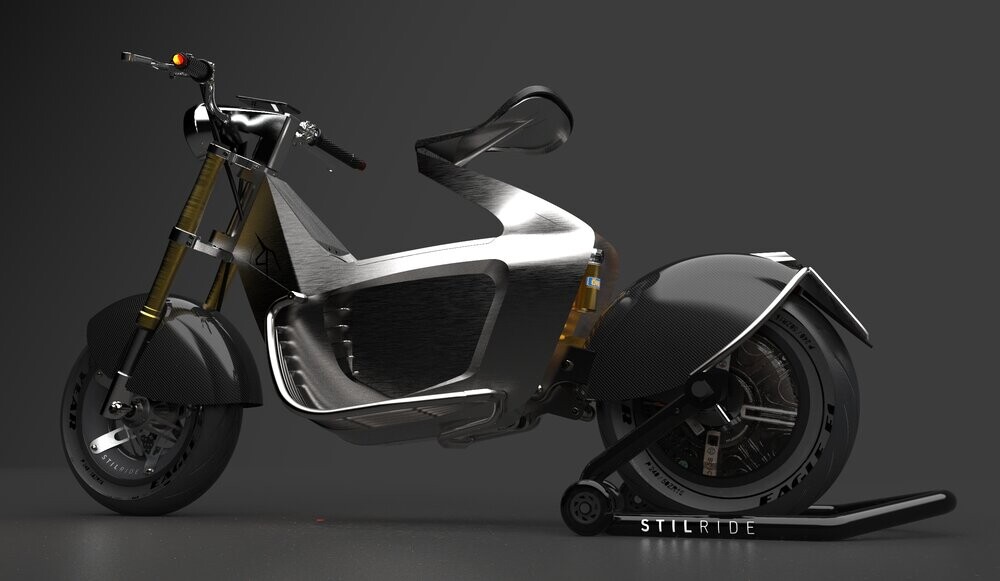 En la moto eléctrica de Stilride su chasis es también carrocería, es decir que no recurre al habitual armazón tubular que va posteriormente carenado con paneles. Y todo ello ofreciendo una imagen de corte futurista, con formas curvas y superficies cóncavas y convexas, aderezado con cierto regusto vintage.