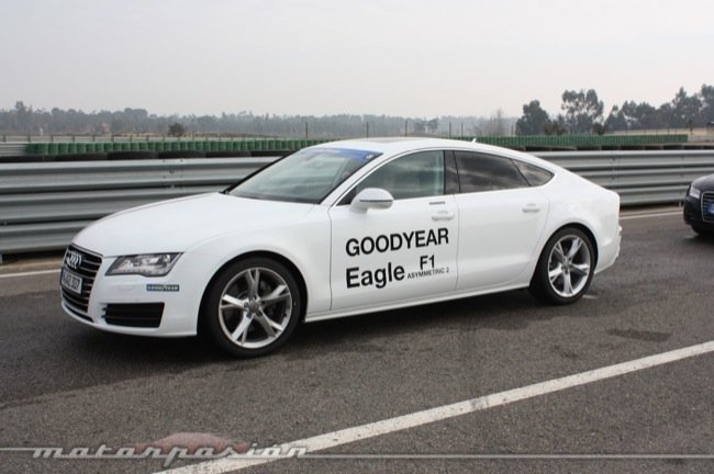¿Pero cómo medirlo? Podría decir que he dado varias vueltas al circuito de Monteblanco (Huelva) con un Audi A7 3.0 TDI Quattro con neumáticos Goodyear Eagle F1 Asymmetric 2 y que el agarre es perfecto, y eso sería la frase más vacía de significado de la historia de Motorpasión. ¿Ese agarre perfecto es gracias al A7, a los neumáticos, al asfalto del circuito o al conductor? (Apostad por los tres primeros, pero no sé en qué medida). Además, ¿qué es agarre perfecto? ¿Y sus competidores?