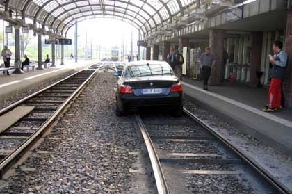Al conductor de este BMW le ocurrió lo mismo, acabando con su coche encima de las vías del tren, también por “culpa” (y ahora ya va entre comillas) de su navegador GPS.