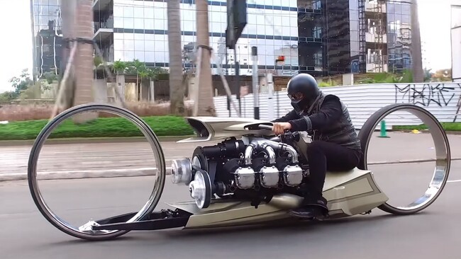 En 2018, el expiloto de Fórmula 1 Tarso Marques tuvo la humorada de mezclar en el TMC Dumont un motor de aviación Rolls Royce de seis cilindros y 300 CV, un esbelto cuerpo de motocicleta y... sí, dos ruedas sin ejes. O sin radios, vaya. Un diámetro de 36 pulgadas, ahí es nada, para las campeonas de las llantas locas como puntos de apoyo de un vehículo tan insólito como ensordecedor.