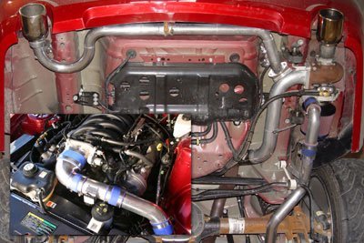En lugar de estar situado bajo el capó, el lugar más lógico para encontrar un turbo, su posición “natural” es donde debería ir el silencioso, o sea, en la parte trasera del coche y por debajo de él. En la foto se ve su instalación en un Mustang S197 y gracia a él, su potencia máxima ha pasado de los 300 a los 400 CV, y gracias a esta instalación, la temperatura del turbo y del motor son inferiores a una instalación corriente de un turbo.