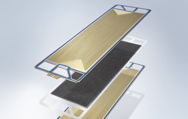 A su vez está rodeada por dos placas bipolares en las que se han fresado los conductos de gas. A través de estos conductos de gas fluye hidrógeno por un lado y oxígeno por el otro. Estas celdas de combustible individuales se apilan una detrás de la otra para crear la pila de celdas de combustible, formando así la fuente de energía.