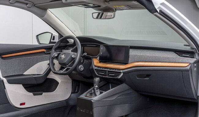 Otros materiales sostenibles que ya formaban parte de los Skoda de última generación son, por ejemplo, las fundas de los asientos de la selección de diseño "Lodge" para el SUV eléctrico Enyaq iV, que llevan un 30% de lana virgen y el 70% restante de poliéster procedente de botellas de PET recicladas.