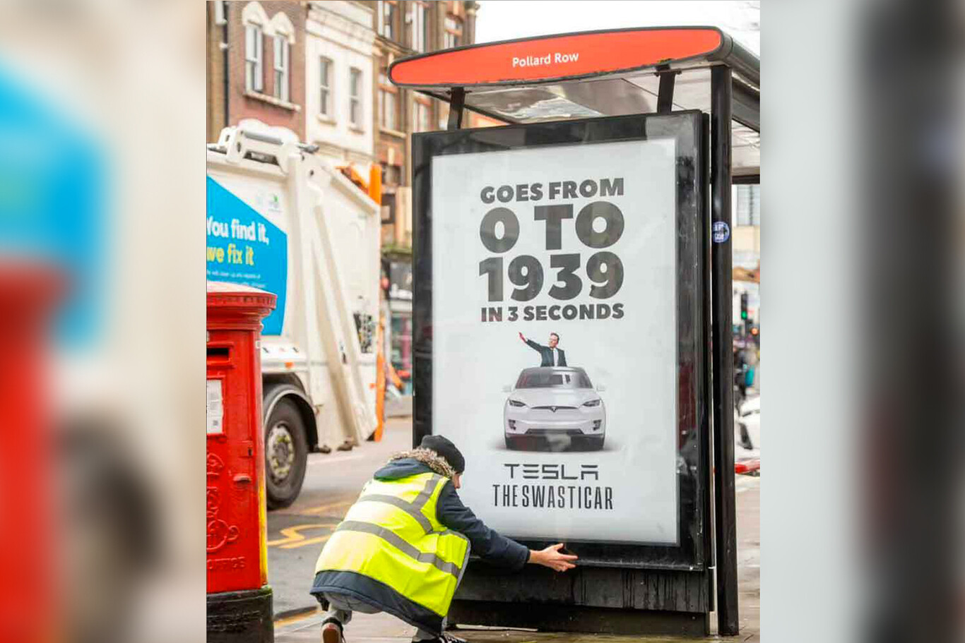 Precisamente en Inglaterra hay activistas que están colocando carteles publicitarios en paradas de autobús en Londres con una parodia de Tesla como marca nazi. "The Swasticar" (El coche esvástica) que "va de 0 a 1939 en 3 segundos", haciendo una analogía entre la aceleración y el año que estalló la Segunda Guerra Mundial, con la invasión de Polonia por la Alemania de Hitler como detonante.