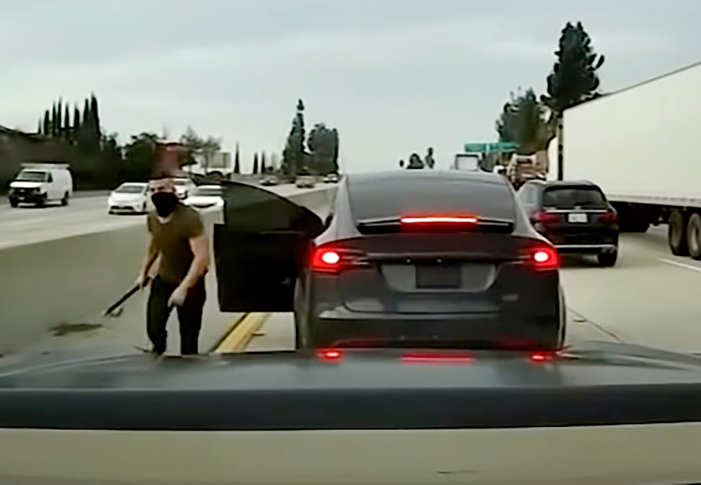 A continuación, empieza a golpear violentamente varias veces al coche que circulaba detrás de él, y cuya cámara lo grabó todo, antes de subirse a su Tesla y darse a la fuga.