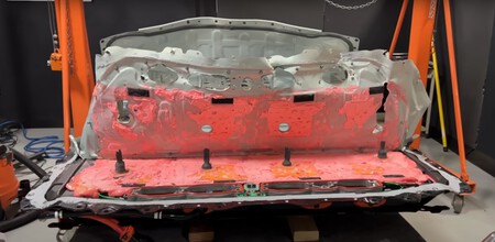Esto, que por sí solo ya volvería imposible recomponer el paquete, parece que quedará como un esfuerzo titánico pero inútil. Y es que bajo el metal las afamadas celdas 4680 permanecen cubiertas tras unos paneles de plástico que, para más inri, están sellados con gruesas capas de una resina similar al poliuretano.